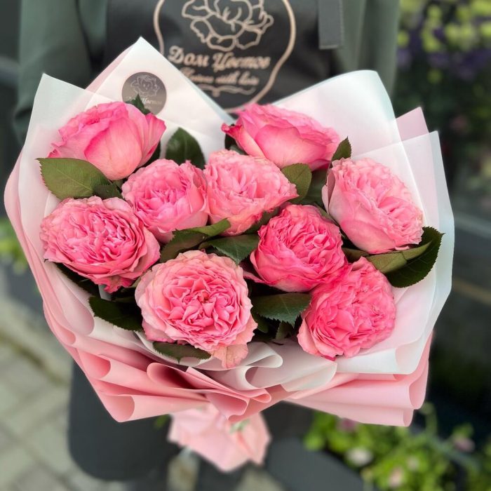 Атласная лента – 1 шт.декоративная упаковка – 1 шт.пионовидная одноголовая роза mayra pink – 9 шт.