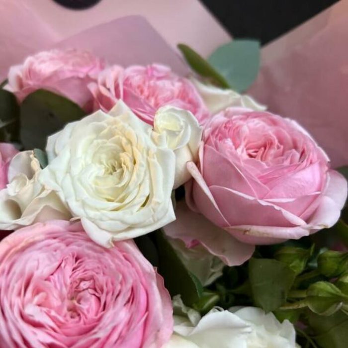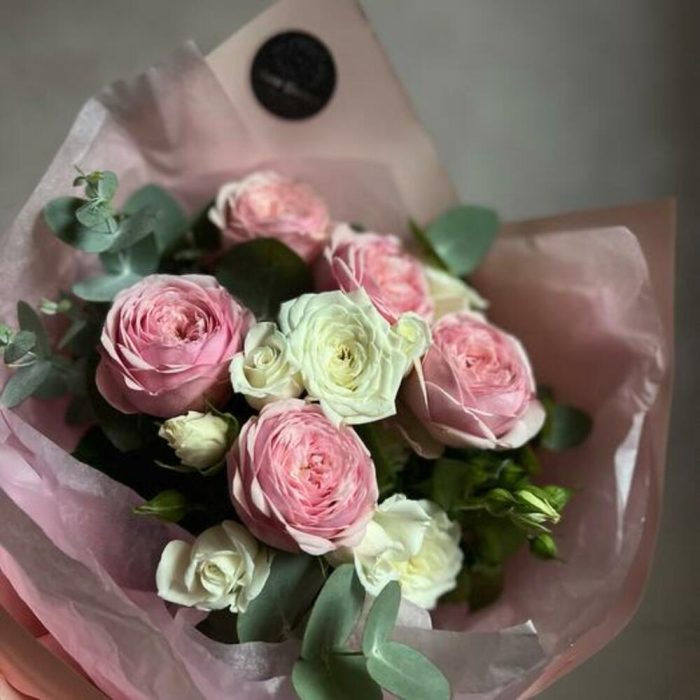 Пионовидная роза кустовая – 2 шт.кустовая роза жанин – 2 шт.Эвкалипт – 3 шт.декоративная упаковка – 2 шт.Атласная лента – 2 шт.