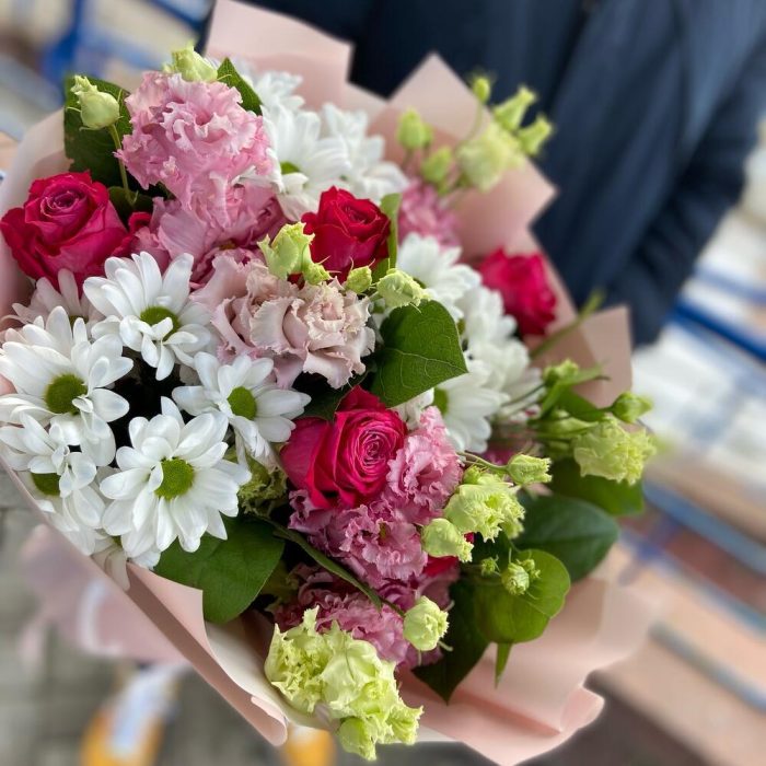 Роза – 5 шт. Эустома – 5 шт. Хризантема кустовая – 3 шт. Салал – 5 шт. Упаковка дизайнерская – 1 шт.