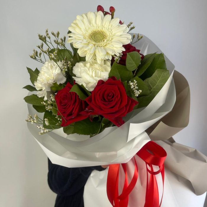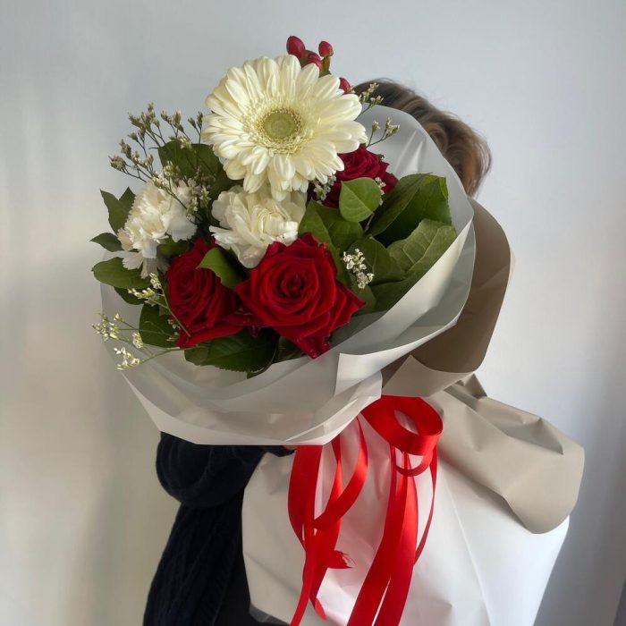 Гиперикум – 1 шт.Лимониум – 1 шт.Роза красная – 3 шт.Гвоздика – 2 шт.Гербера – 1 шт.Салал листья – 2 шт.Пленка матовая – 6 шт.