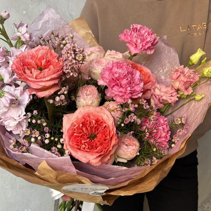 Роза пионовидная – 3 шт.Роза пионовидная кустовая – 2 шт.Гвоздика – 3 шт.Маттиола – 2 шт.Ваксфлауэр – 3 шт.Лизиантус – 1 шт.Упаковка дизайнерская – 1 шт.