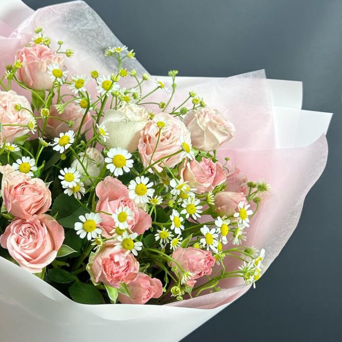 Матрикария – 4 шт.Кустовая роза розовая – 5 шт.Упаковка дизайнерская – 1 шт.
