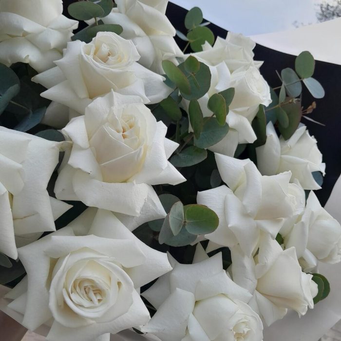Эвкалипт – 6 шт.Лента атласная – 3 шт.Упаковка дизайнерская – 4 шт.Роза французская – 13 шт.