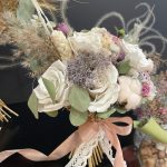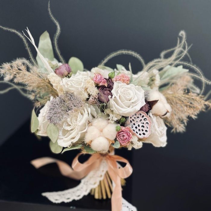 Роза стабилизированная – 6 шт.Роза сухоцвет – 15 шт.Хлопок (сухоцвет) – 6 шт.Эвкалипт сухоцвет – 7 шт.Статица – 11 шт.трахелиум сухоцвет – 3 шт.Лотос сухой – 1 шт.ковыль связка – 3 шт.Колоски – 31 шт.