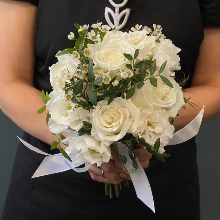 Ваксфлауэр – 1 шт.Лента – 1 шт.Лизиантус – 2 шт.Роза одноголовая – 5 шт.Фисташка – 1 шт.