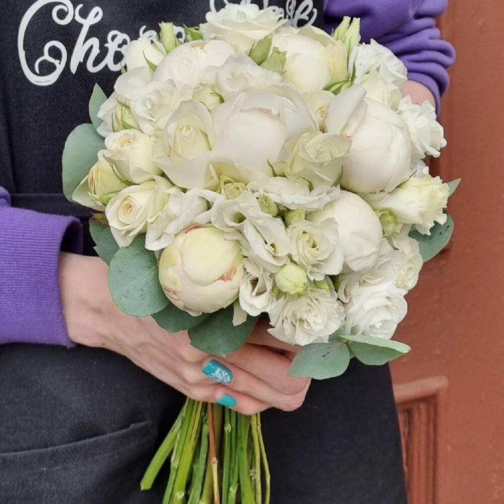 Лизиантус – 4 шт.Пион – 7 шт.Кустовая роза – 5 шт.Лента атласная – 3 шт.