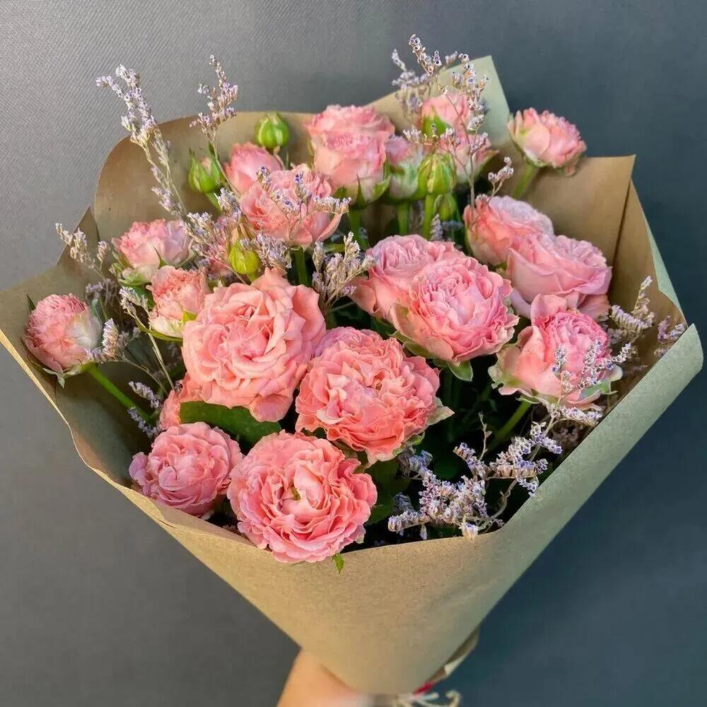 роза кустовая кучерявая – 5 шт.Лимониум – 3 шт.Упаковка крафт – 1 шт.Джут – 1 шт.