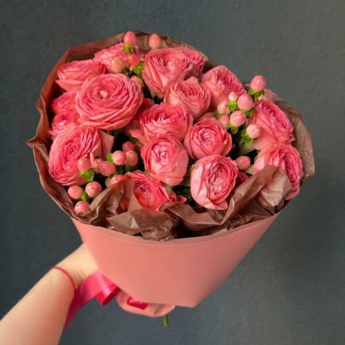 Роза кустовая пионовидная – 5 шт.Гиперикум – 3 шт.декоративная упаковка – 1 шт.Атласная лента – 1 шт.