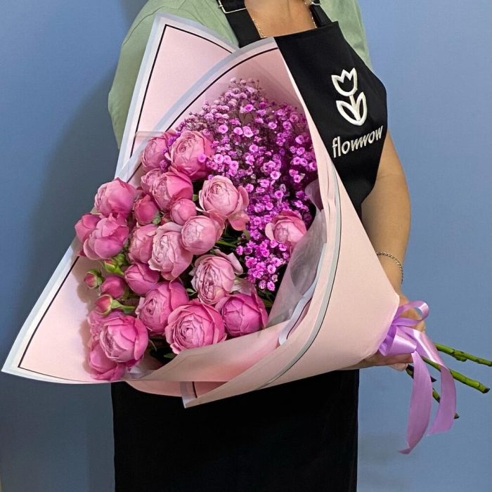 Лента атласная – 1 шт.Упаковка дизайнерская – 2 шт.Гипсофила розовая – 2 шт.пионовидная роза сильва – 5 шт.