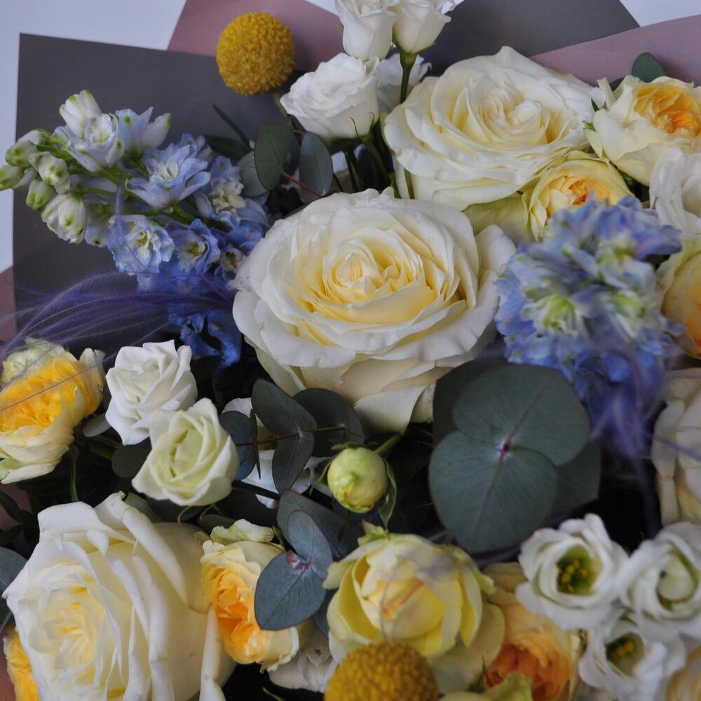 Дельфиниум – 3 шт.Краспедия – 3 шт.Эвкалипт – 2 шт.Эустома – 5 шт.Фисташка – 10 шт.Роза пионовидная – 5 шт.Роза кустовая пионовидная – 3 шт.Упаковка дизайнерская – 2 шт.