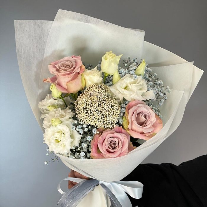 Гипсофила – 1 шт.Лента – 2 шт.Лизиантус – 2 шт.Озотамнус – 1 шт.Роза – 3 шт.Упаковка – 1 шт.