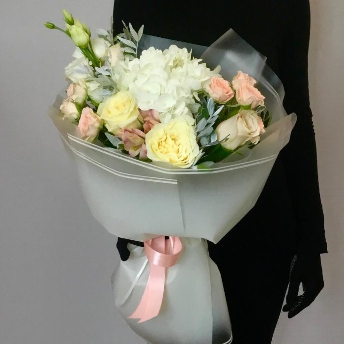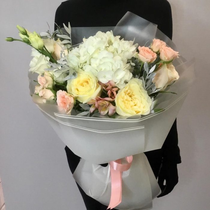 Альстромерия – 1 шт.Гортензия – 1 шт.Кустовая роза – 2 шт.Эустома – 1 шт.Лента атласная – 1 шт.Фисташка – 2 шт.Пленка матовая – 2 шт.роза шарман – 2 шт.роза кендлайт эквадор – 2 шт.