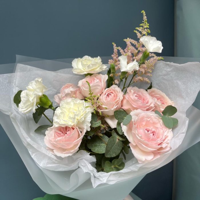 Астильба – 2 шт.Роза кустовая – 2 шт.Эвкалипт – 2 шт.Гвоздика – 3 шт.Лента атласная – 1 шт.Тишью – 1 шт.Кустовая гвоздика – 1 шт.Упаковка дизайнерская – 2 шт.