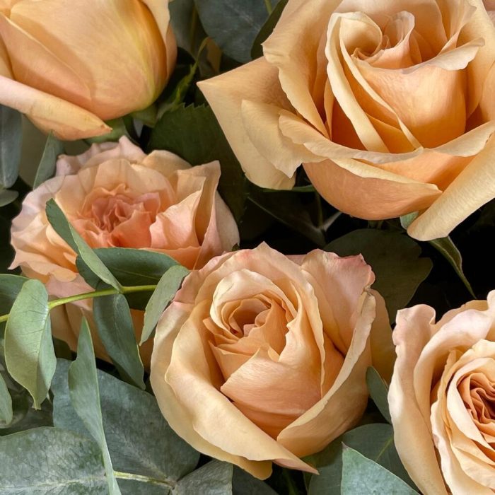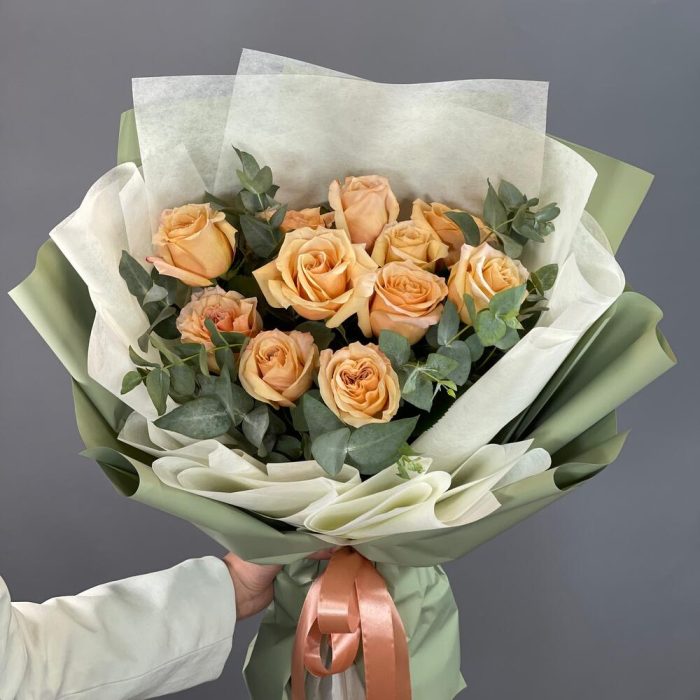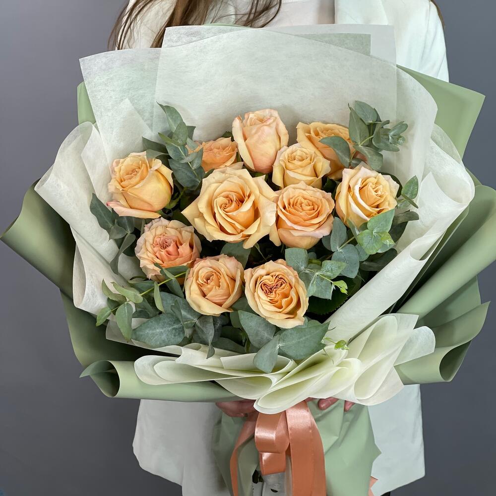 Лента – 2 шт.Эвкалипт – 2 шт.Упаковка – 2 шт.Роза шиммер – 11 шт.