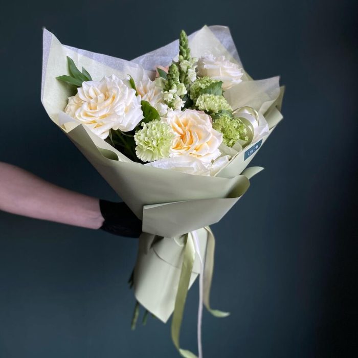 кендилайт – 5 шт.Вибурнум – 1 шт.Рускус – 3 шт.антиринум – 3 шт.Гвоздика – 3 шт.Упаковка дизайнерская – 1 шт.уходовое средство для цветов – 1 шт.транспортировочная упаковка – 1 шт.роза кустовая шиммер – 3 шт.