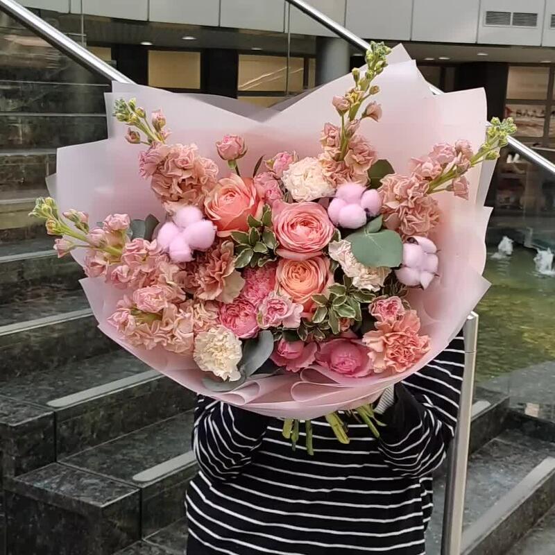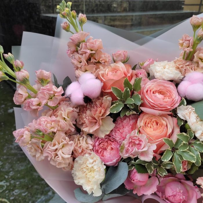 Маттиола – 5 шт.Роза – 3 шт.Роза кустовая – 1 шт.Роза кустовая пионовидная – 1 шт.Диантус – 6 шт.Эвкалипт – 1 шт.Питтоспорум – 1 шт.Хлопок – 3 шт.Упаковка дизайнерская – 2 шт.Лента атласная – 2 шт.