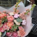 Букет с пионовидной розой, матиолой и гвоздикой