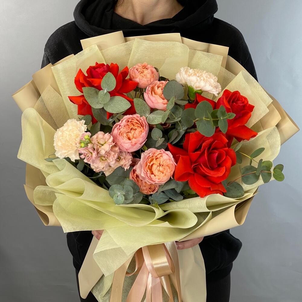 Маттиола – 1 шт.Роза кустовая – 2 шт.Эвкалипт – 2 шт.Роза одноголовая – 3 шт.Гвоздика – 2 шт.Лента атласная – 2 шт.Фисташка – 3 шт.Упаковка дизайнерская – 2 шт.