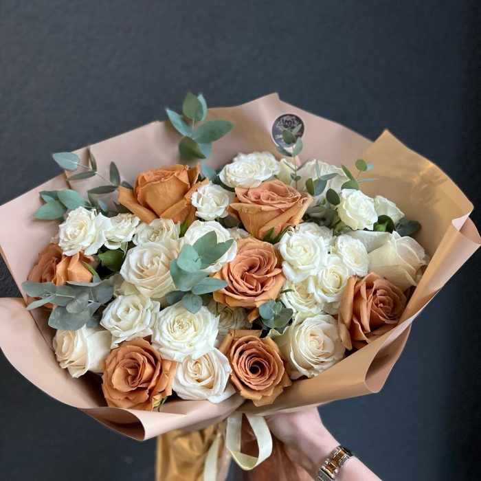 Одноголовая роза – 6 шт.Кустовая роза – 6 шт.роза тоффи – 7 шт.Эвкалипт – 8 шт.декоративная упаковка – 1 шт.Атласная лента – 1 шт.