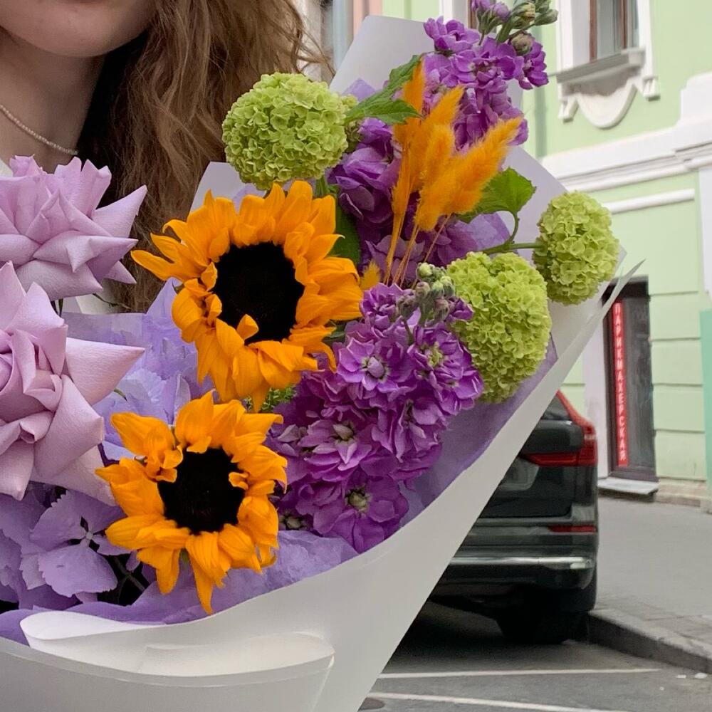 Роза – 3 шт.Гортензия – 1 шт.Подсолнух – 2 шт.Вибурнум – 1 шт.Гвоздика – 3 шт.Аллиум – 1 шт.Маттиола – 2 шт.Лагурус – 1 шт.Упаковка дизайнерская – 1 шт.