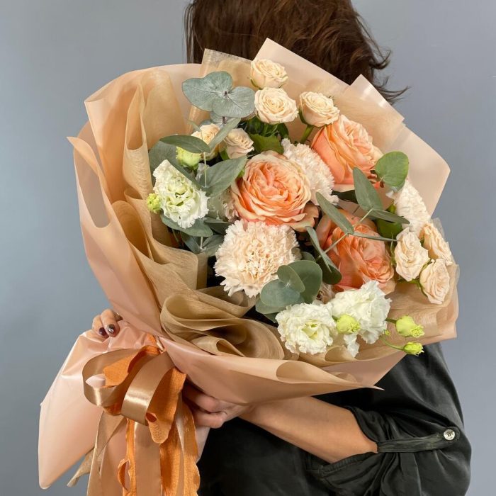 Лента – 1 шт.Лизиантус – 2 шт.Роза кустовая – 2 шт.Эвкалипт – 2 шт.Упаковка – 2 шт.Гвоздика – 2 шт.Роза кахала – 3 шт.