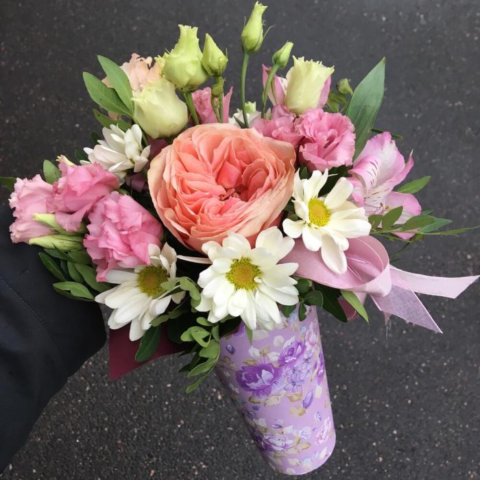 Роза кахала пионовидная – 1 шт.Альстромерия – 1 шт.Хризантема кустовая – 2 шт.Лизиантус розовый – 2 шт.Коробка конус – 1 шт.Оазис флористический – 1 шт.Лента атласная – 1 шт.