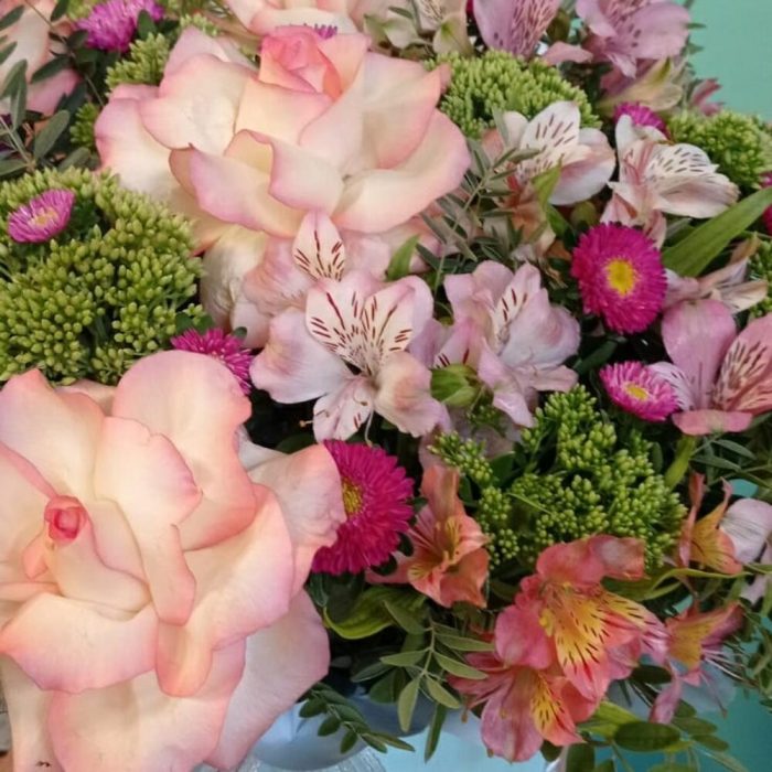 Великолепное сочетание розы Джумилия с розовой альстермерией, не оставит равнодушным ваших любимых людей