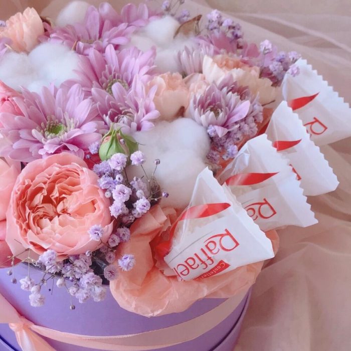 Гипсофила – 1 шт.Хлопок – 5 шт.Хризантема кустовая – 1 шт.Диантус – 3 шт.Коробка шляпная – 1 шт.Конфеты Raffaello – 4 шт.Пионовидная роза джульетта – 1 шт.инструкция по уходу за цветами – 1 шт.любовь флориста – 1 шт.
