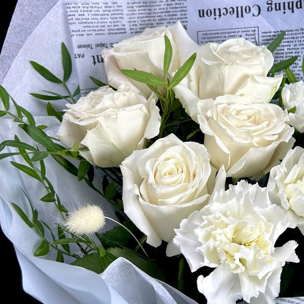 Гвоздика одноголовая – 6 шт.роза премиальная пионовидная «плая бланка» – 5 шт.Лагурус (сухоцвет) – 3 шт.Фисташка – 3 шт.Упаковка дизайнерская – 1 шт.
