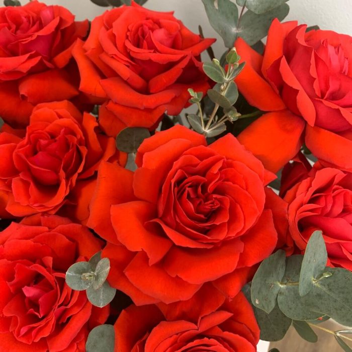 цилиндр 21*21 – 1 шт.Оазис флористический – 2 шт.Роза нина эквадор – 15 шт.Эвкалипт – 10 шт.Лента атласная – 1 шт.