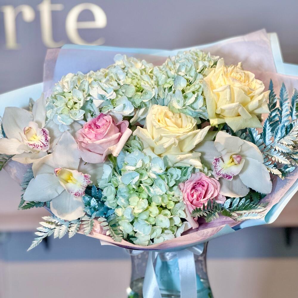 Упаковка дизайнерская – 5 шт.Гортензия голубая – 3 шт.Роза – 4 шт.орхидея белая цимбидиум – 3 шт.Папоротник – 6 шт.