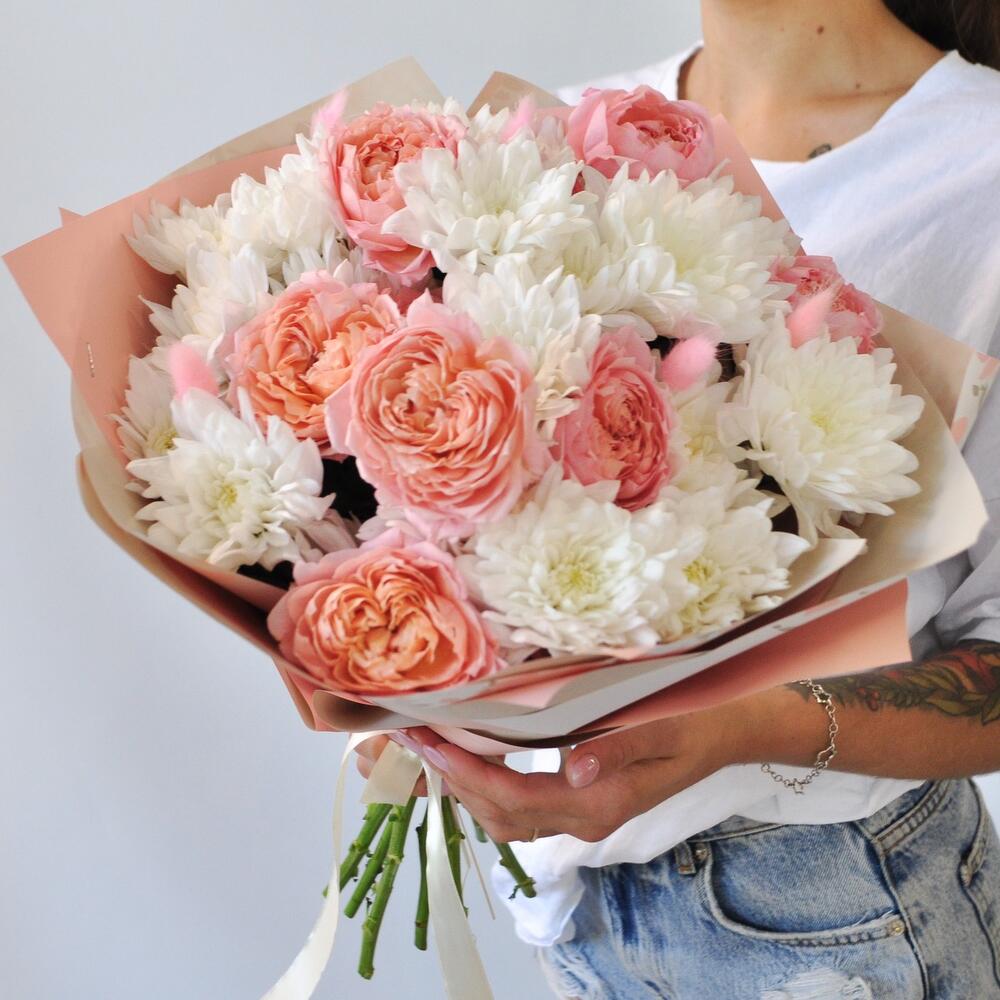 Хризантема кустовая – 5 шт.Роза пионовидная кустовая – 5 шт.Лагурус – 5 шт.Упаковка дизайнерская – 2 шт.Лента атласная – 1 шт.