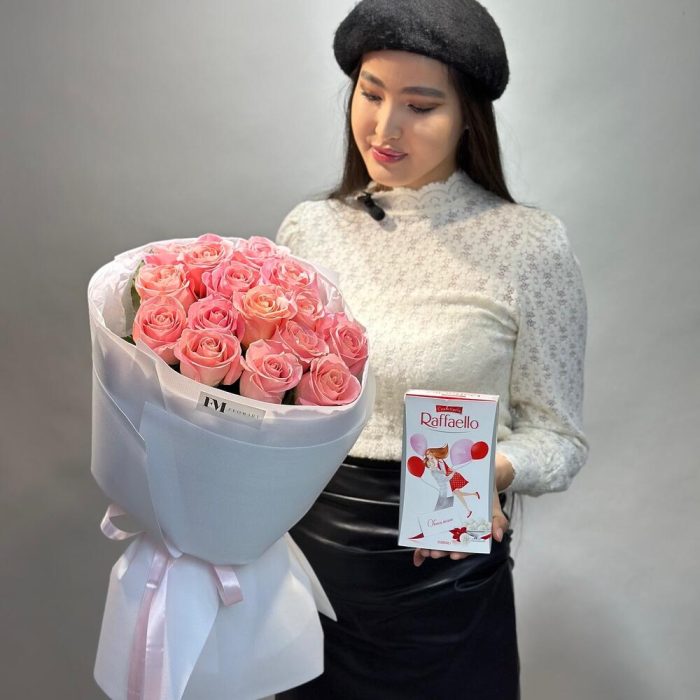 Нежный букет из 15 роз, в подарок Raffaello 70 грамм.