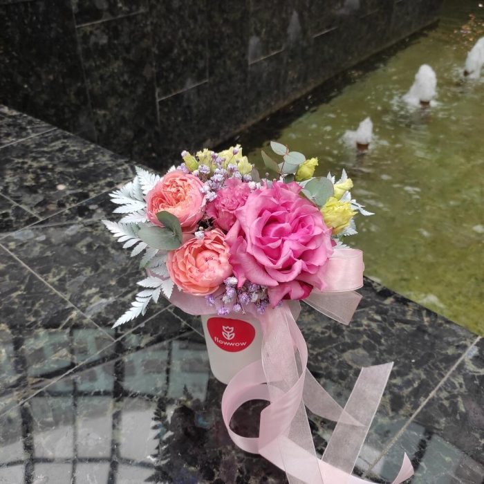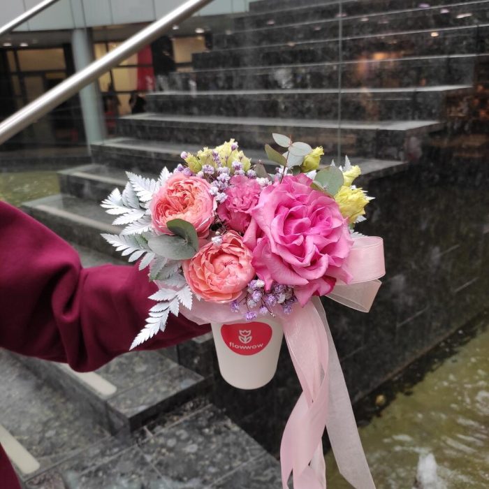 роза квинс кроун – 1 шт.гипосфилла – 1 шт.пароротник – 1 шт.Роза кустовая джульетта – 1 шт.Оазис – 1 шт.Стакан – 1 шт.Лента – 2 шт.