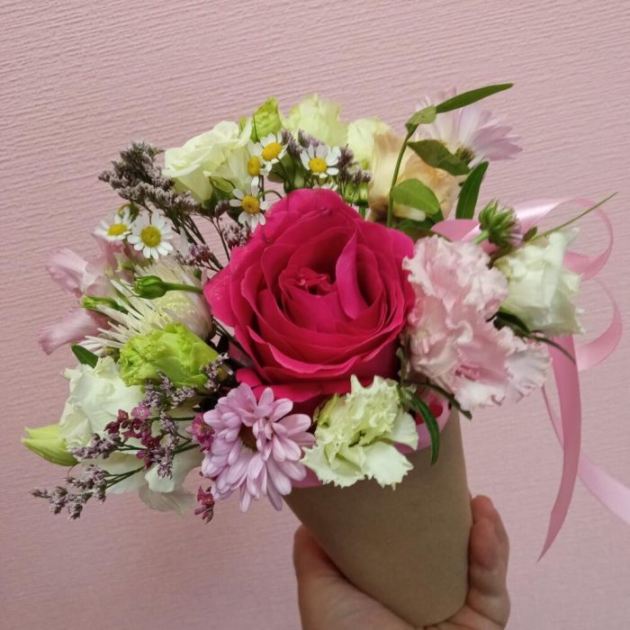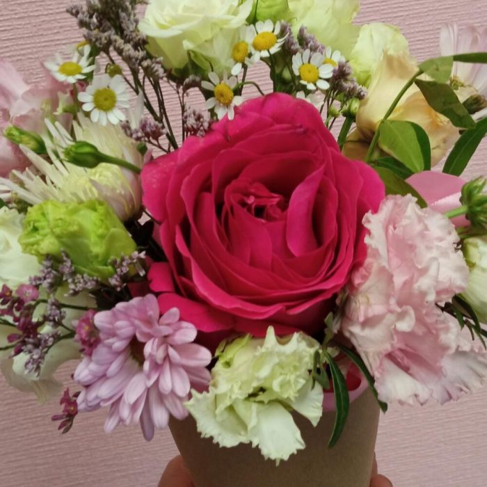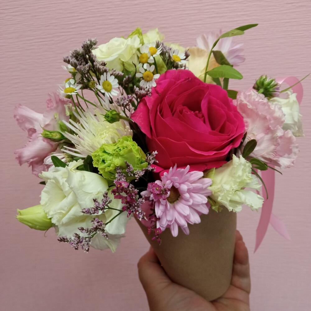 Роза кустовая – 1 шт.Роза – 1 шт.Оазис флористический – 1 шт.зелень декоративная – 1 шт.эустома (лизиантус) – 1 шт.стакан крафт – 1 шт.
