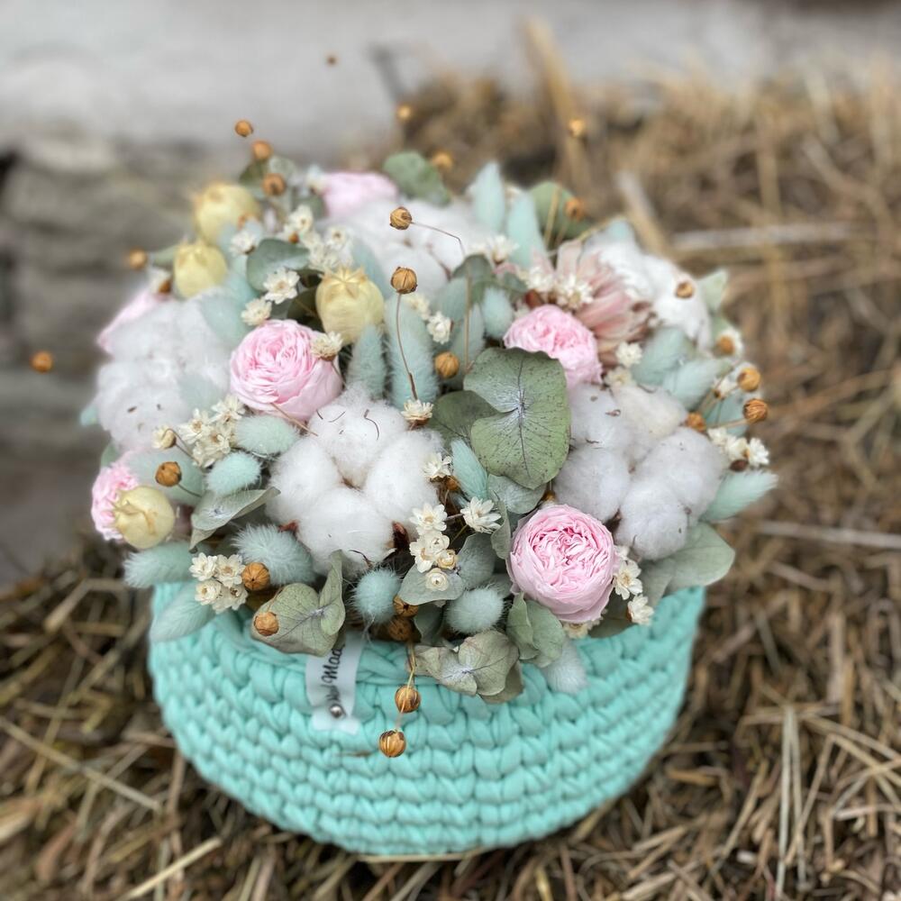 Композиция из сухоцветов и стабилизированных цветов , в вязаном кашпо , ручной работы