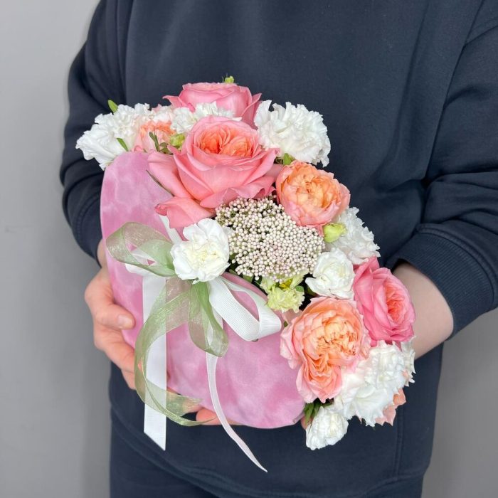 “Сладкое сердце ” – цветочная композиция с сладостями в коробке “Сердце”