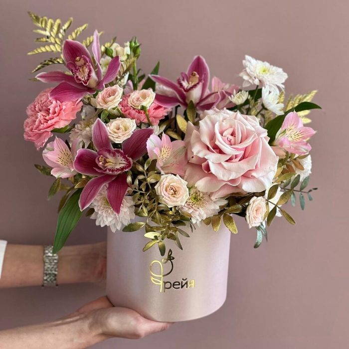 Альстромерия – 1 шт.Орхидея Цимбидиум – 3 шт.Папоротник – 1 шт.Роза кустовая – 1 шт.Хризантема кустовая – 1 шт.Гвоздика – 2 шт.Фисташка – 2 шт.Коробка брендированная – 1 шт.Роза пинк мондиаль – 1 шт.Губка флористическая – 1 шт.