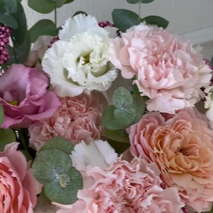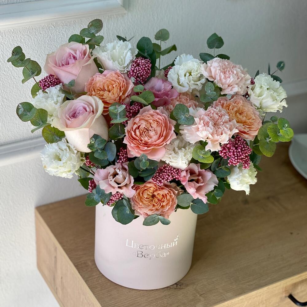 Кустовая роза – 2 шт.Гвоздика – 3 шт.Коробка шляпная – 1 шт.Роза розовая – 2 шт.эустома розовая – 1 шт.эустома белая – 2 шт.озотамнус стабилизированный – 9 шт.эвкалипт композиционный – 30 шт.