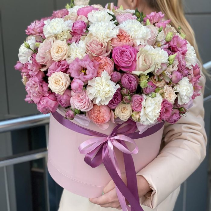 Кустовая пионовидная роза – 29 шт. Одноголовая роза – 13 шт. Гвоздика – 11 шт. Коробка – 1 шт. Оазис – 4 шт. Альстромерия – 3 шт. эустома алиса роуз – 10 шт.
