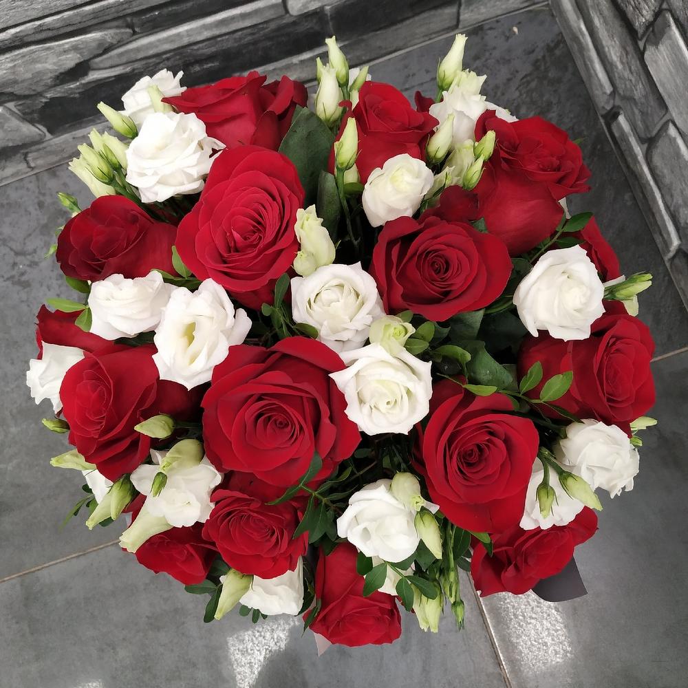 Роза Эквадор – 19 шт.Лизиантус Алиса белый – 5 шт.зелень декоративная – 10 шт.Коробка шляпная – 1 шт.Оазис флористический – 1 шт.