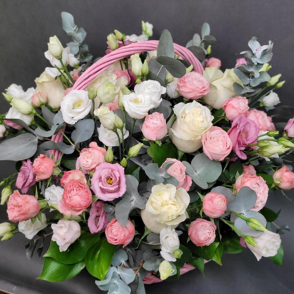 Корзина из роз и лизиантуса с эвкалиптом