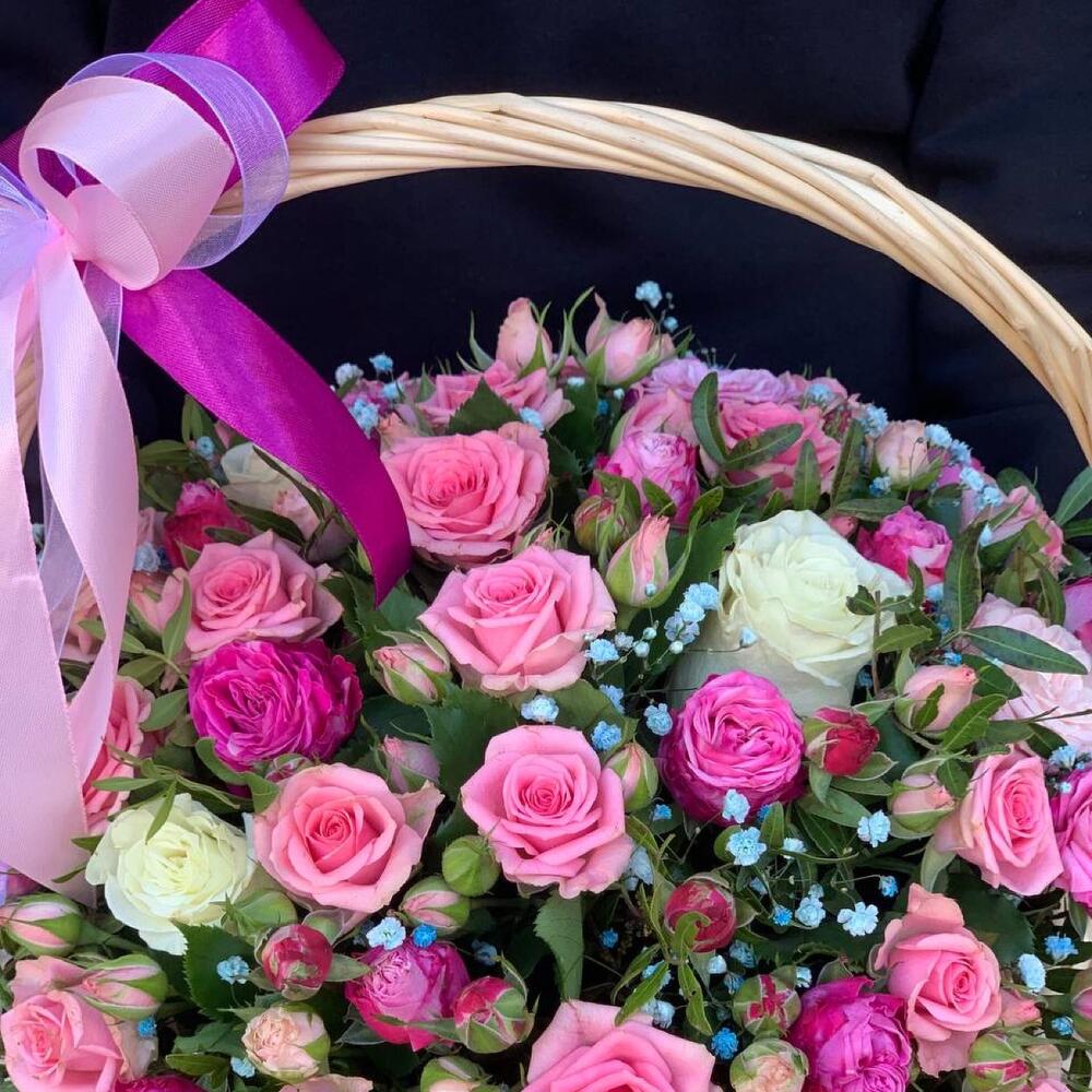 Корзина плетеная – 1 шт.Оазис флористический – 2 шт.Лента атласная – 2 шт.Фисташка – 2 шт.Роза Эквадор – 3 шт.Гипсофила – 1 шт.Роза кустовая – 5 шт.