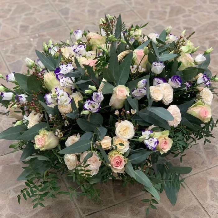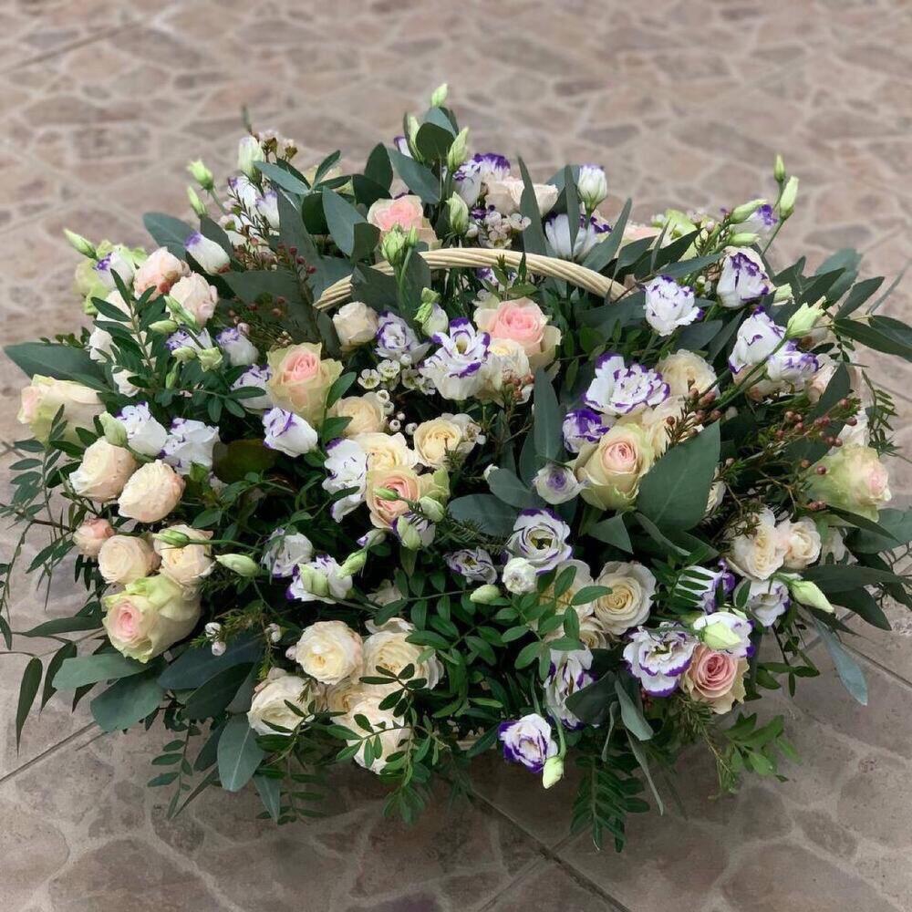 Ваксфлауэр – 2 шт.Лизиантус – 10 шт.Роза кустовая – 11 шт.Эвкалипт – 12 шт.Роза Эквадор – 15 шт.Фисташка – 10 шт.Корзина плетеная – 1 шт.Оазис флористический – 3 шт.