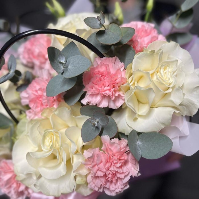 Лента – 2 шт.Эвкалипт – 7 шт.Диантус – 7 шт.Роза Мондиаль – 5 шт.Сумка – 1 шт.Оазис флористический – 1 шт.