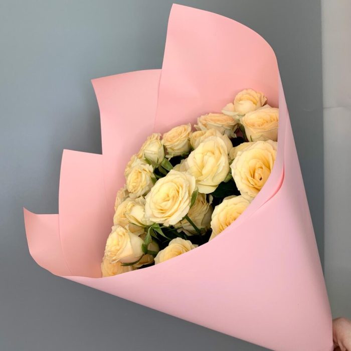Роза кустовая – 5 шт.Лента атласная – 2 шт.Дизайнерская упаковка – 1 шт.