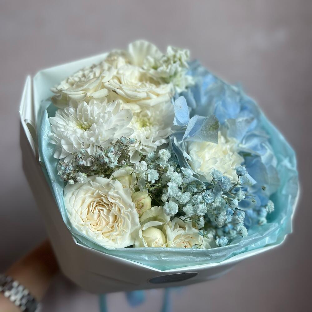 Гортензия – 1 шт.Гвоздика – 2 шт.Кустовая роза – 2 шт.Хризантема – 1 шт.Гипсофила – 1 шт.Маттиола – 1 шт.декоративная упаковка – 1 шт.Атласная лента – 1 шт.