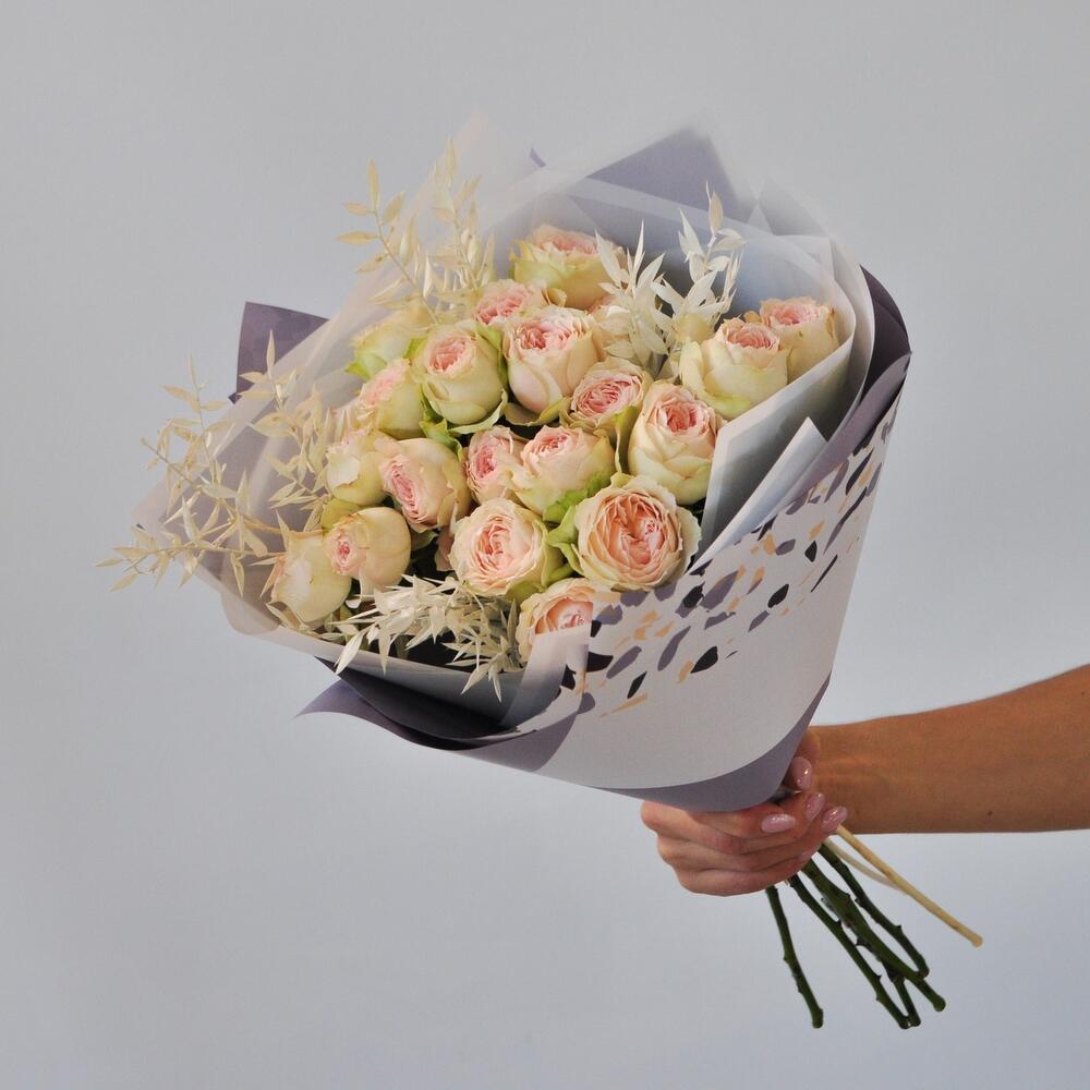 Кустовая роза розовая – 7 шт.Оформление – 1 шт.рускус стабилизированный – 3 шт.