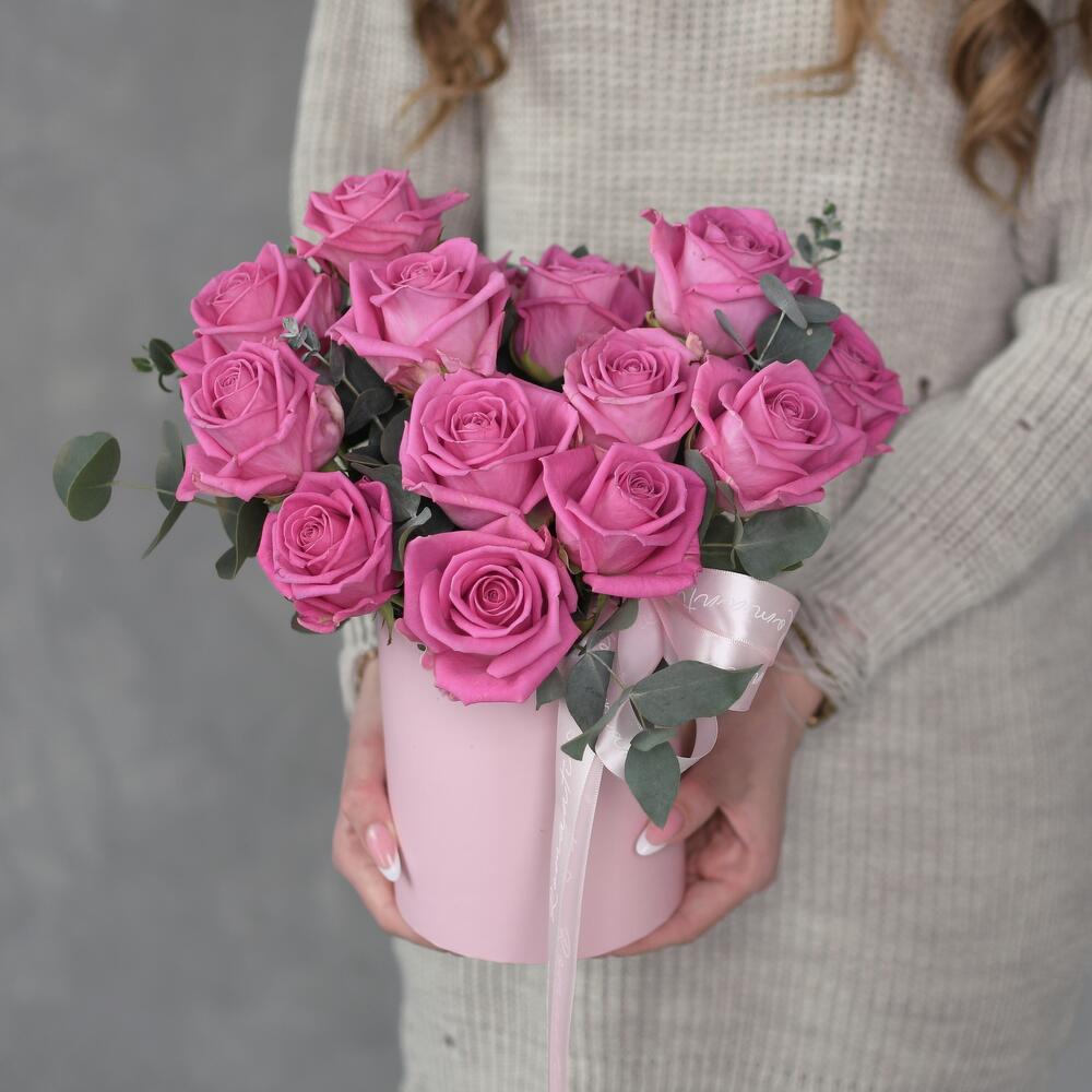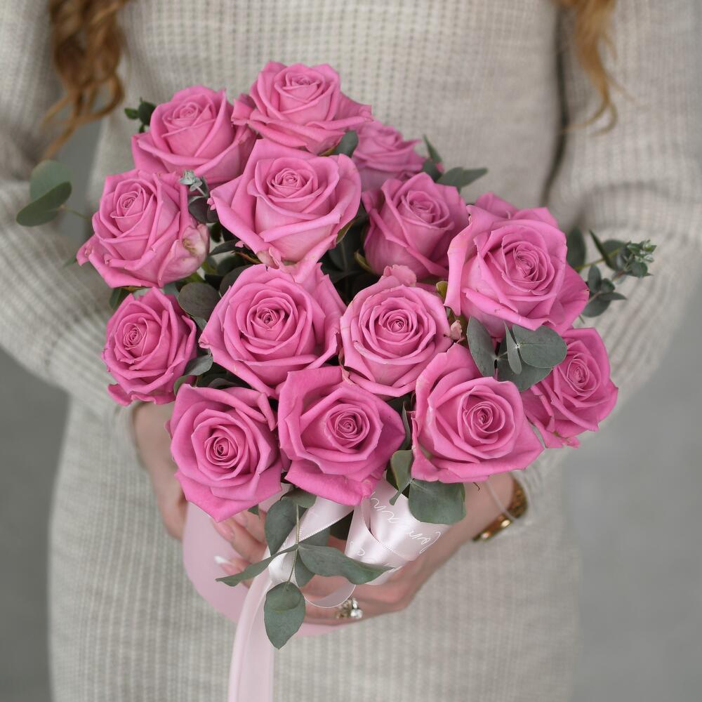 Роза аква – 15 шт.Эвкалипт – 3 шт.Шляпная коробка – 1 шт.