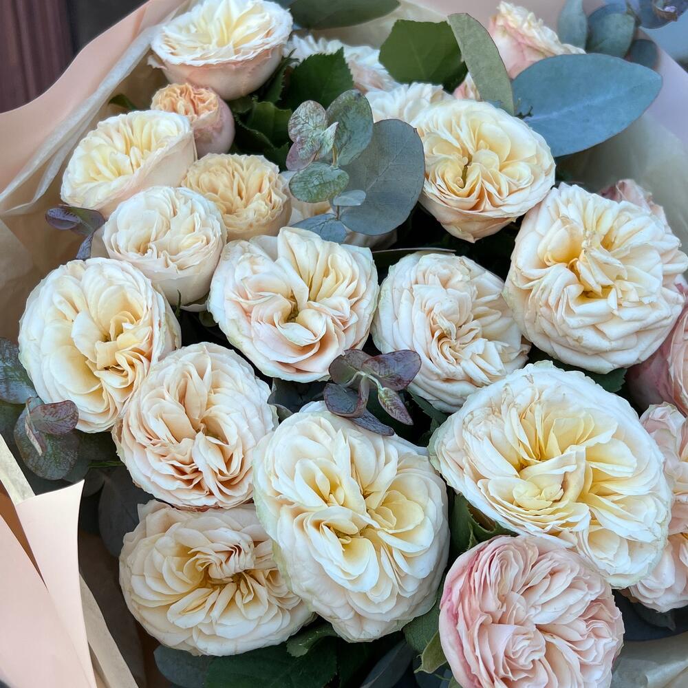 Эвкалипт – 5 шт.Лента атласная – 2 шт.Тишью – 3 шт.Пленка матовая – 5 шт.роза пионовидная кустовая трендсеттер – 5 шт.